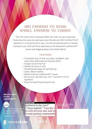 This NIV Giant Print Compact Bible for Girls can go anywhere a girl goes. Featuring the easy-to-read exclusive Zondervan NIV Comfort Print® typeface in a 12-point print size, it is well-proportioned in a handy compact size. Girls will love opening up the floral Leathersoft™ cover and digging deep into God’s Word.